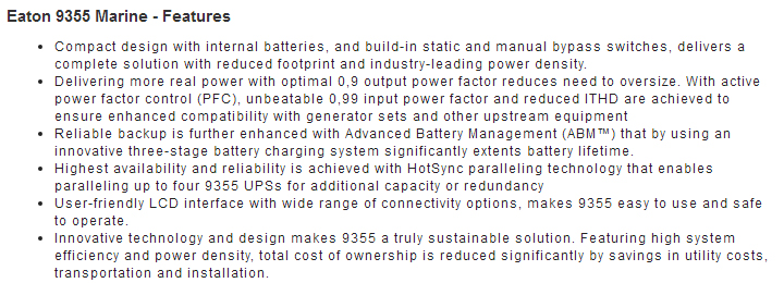 Double-conversion online technology with power ratings 8-40 kVA, DNV type approved, BV type approved and ABS design assessed up to 15 kVA, three-phase input and output, small foot print, patented Hot Sync parallel capability up to four redundant systems, ABM technology to extend battery service life, wide communication options.